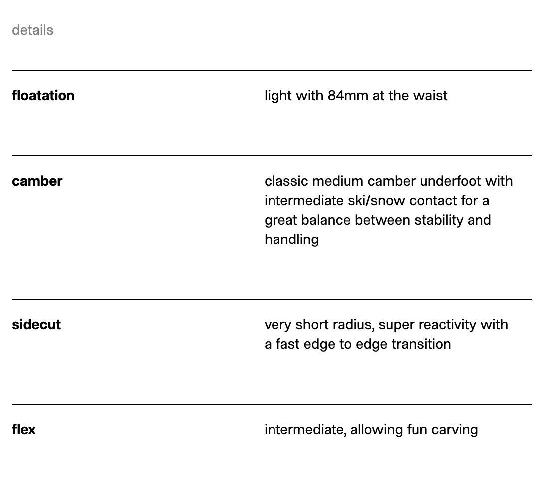Sharp and wild yet light and comfortable, the new Octo is designed to satisfy alpine skiing aesthetes. Carving purists will find an engaging and high-performing corduroy eater. While its short radius and sporty flex may evoke a slalom ski, the light oversteer provided by the combination of tapered tips and rocker allows you to change the rhythm and shape of your turns on demand, smoothly transitioning from short to medium-range turns—or even skids if that's your preference. The construction, which combines poplar wood and fiberglass, gives the Octo a solid and confidence-inspiring feel while remaining light and agile underfoot. This sensation is further enhanced by its 84mm width, facilitating swift edge-to-edge transitions.